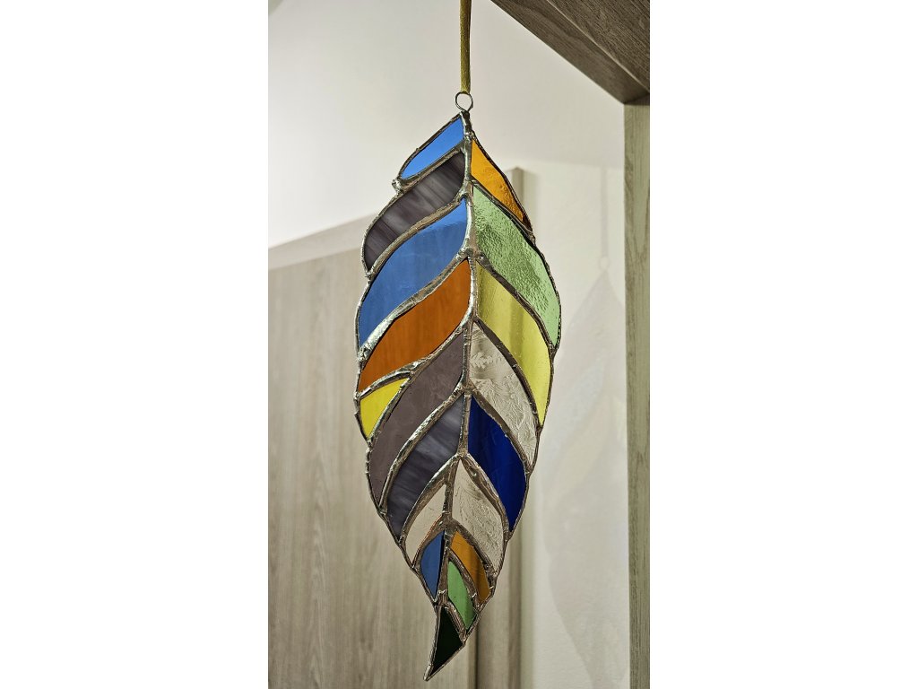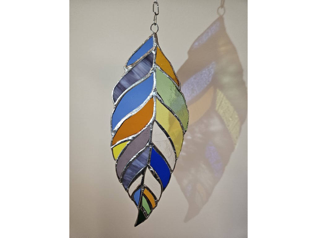 Dodejte svému domovu kouzlo barevné přírody! Tento ručně vyrobený vitrážový list oživí prostor hrou světla a odstínů, které se mění podle dopadu slunečních paprsků.